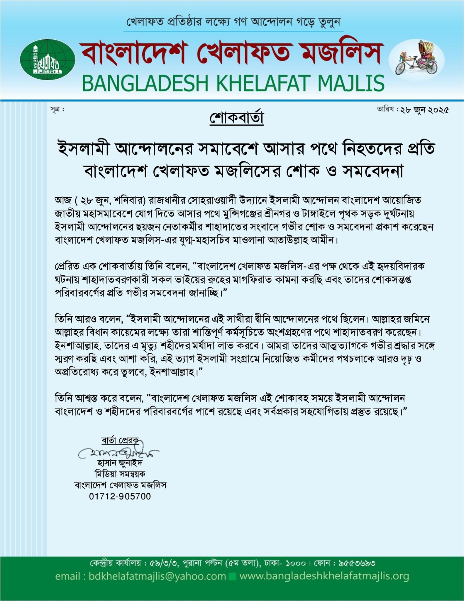 ইসলামী আন্দোলনের সমাবেশে আসার পথে নিহতদের প্রতি বাংলাদেশ খেলাফত মজলিসের শোক ও সমবেদনা