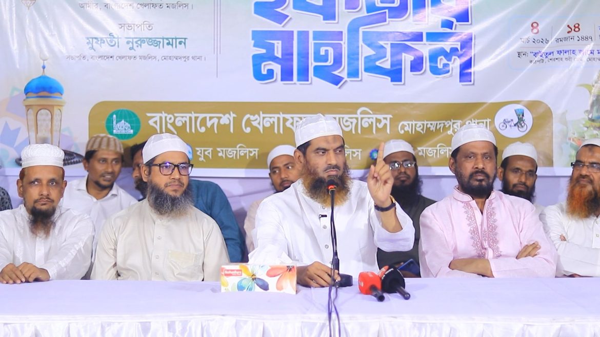 ঢাকা, ৪ মার্চ (বুধবার): বাংলাদেশ খেলাফত মজলিস মোহাম্মদপুর থানা ও সহযোগী সংগঠনগুলোর উদ্যোগে ইফতার মাহফিল অনুষ্ঠিত হয়েছে। মোহাম্মদপুরস্থ বায়তুল ফালাহ মিলনায়তনে বাংলাদেশ খেলাফত মজলিস মোহাম্মদপুর থানা সভাপতি মাওলানা নুরুজ্জামানের সভাপতিত্বে প্রধান অতিথি ছিলেন আমীরে মজলিস আল্লামা মামুনুল হক।