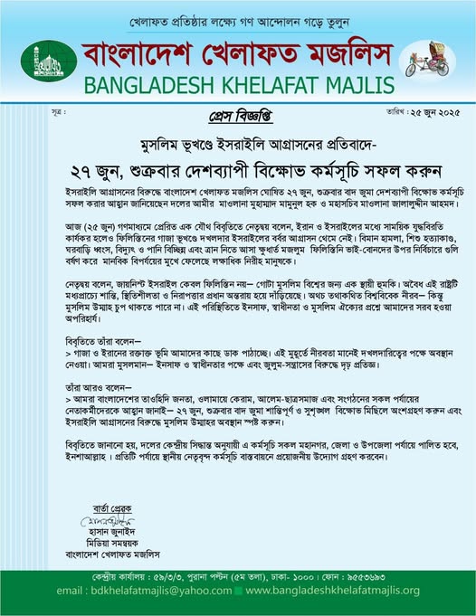 মুসলিম ভূখণ্ডে ইসরাইলি আগ্রাসনের প্রতিবাদে- ২৭ জুন, শুক্রবার দেশব্যাপী বিক্ষোভ কর্মসূচি সফল করুন— বাংলাদেশ খেলাফত মজলিস