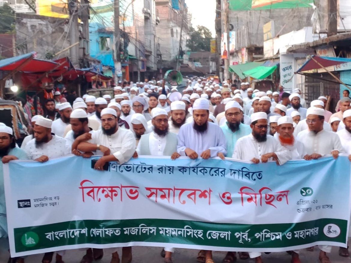 গণভোটের রায় কার্যকরের দাবিতে বাংলাদেশ খেলাফত মজলিস ময়মনসিংহ পূর্ব, পশ্চিম ও মহানগর শাখার উদ্যোগে বিক্ষোভ সমাবেশ ও মিছিল অনুষ্ঠিত হয়েছে।