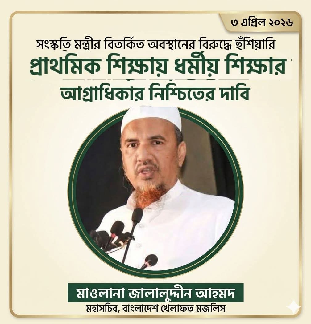 আজ ৩ এপ্রিল শুক্রবার বাংলাদেশ খেলাফত মজলিস-এর মহাসচিব মাওলানা জালালুদ্দীন আহমদ এক বিবৃতিতে বলেন, সাম্প্রতিক সময়ে প্রাথমিক শিক্ষা ব্যবস্থা ও সাংস্কৃতিক কার্যক্রম ঘিরে সরকারের কিছু উদ্যোগ এবং বক্তব্য গভীর উদ্বেগজনক।